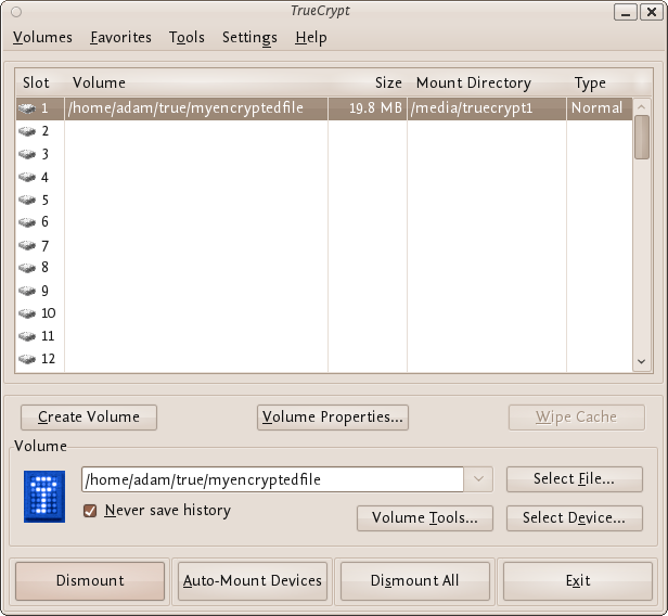 We will create our TrueCrypt volume in the folder 'adam/true' and the filename of the volume (container) will be 'myencryptedfile'. You may, of course, choose any other filename and location you like (for example, on a USB stick). Note that the file 'myencryptedfile' does not exist yet - TrueCrypt will create it. Press 'Save' when you are ready. The file selector window should close.