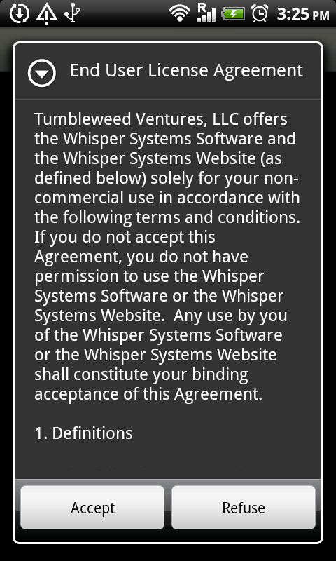 After you have acknowledged the permissions and installed the app, you are ready to start it, as soon as you do so you are confronted with the "End User License Agreement", press accept to continue. A new pop-up telling you this is beta software will appear which you have to acknowledge too.