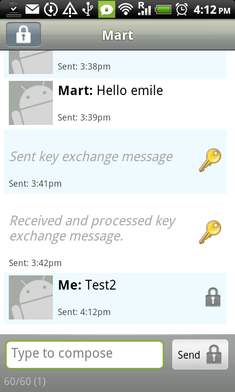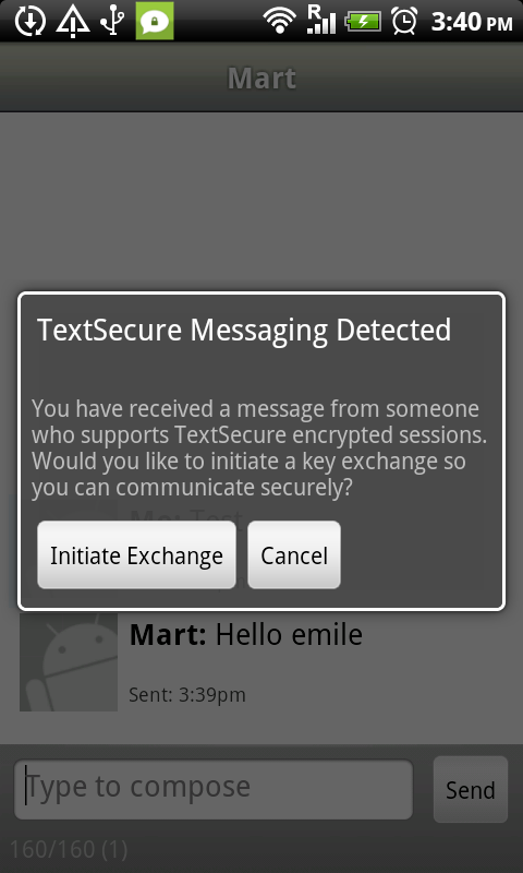After this step you are ready to use TextSecure to send unencrypted messages. If other people also use TextSecure this is automatically detected, it will then present you with the option to send them your key. Exchange keys is needed to get full end-to-end encryption. This process is described in the next steps. It is also possible to manually start this process by clicking the menu button and choosing the option "secure session".