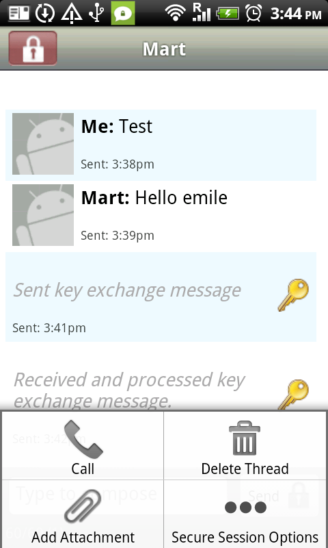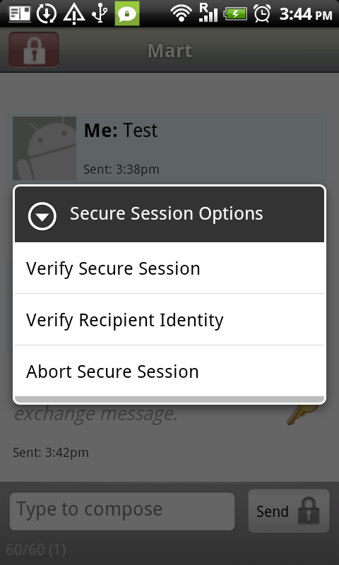 after these steps your communications are secure, but you have not acquired a trust relation, put in other words, the channel is secure but you are not entirely sure who you're talking to. So keeping that in mind, the next thing to do is to verify that you are indeed talking to the right person (a sender's phone number can be easily forged, so you need a more secure way to check the identity). In the conversation window press the menu button and select "Secure Session Options". In the window that appears select "Verify Recipient Identity".