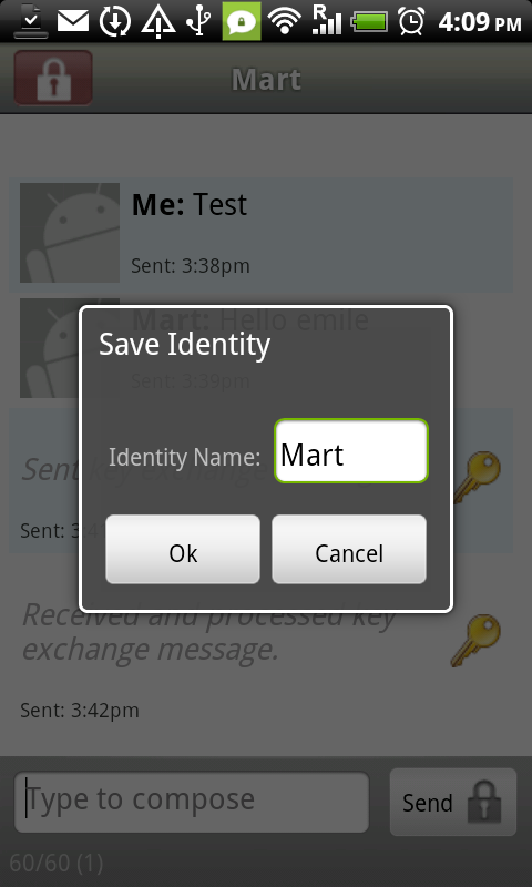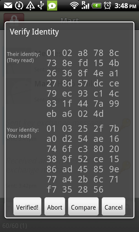 The following window shows your and theirs identity fingerprint. You can for instance call them and check if the keys are correct. If you happen to be close together to set this up, TextSecure also allows you to use your Barcode scanner to check the keys. To start this, select compare and follow the instructions. If you are done verifying using any of the other methods, select "Verified!" and select OK in the next screen. A Save Identity popup appears, usually the name is already filled in correctly and you can just push the "Ok" button twice to start your authenticated messaging.