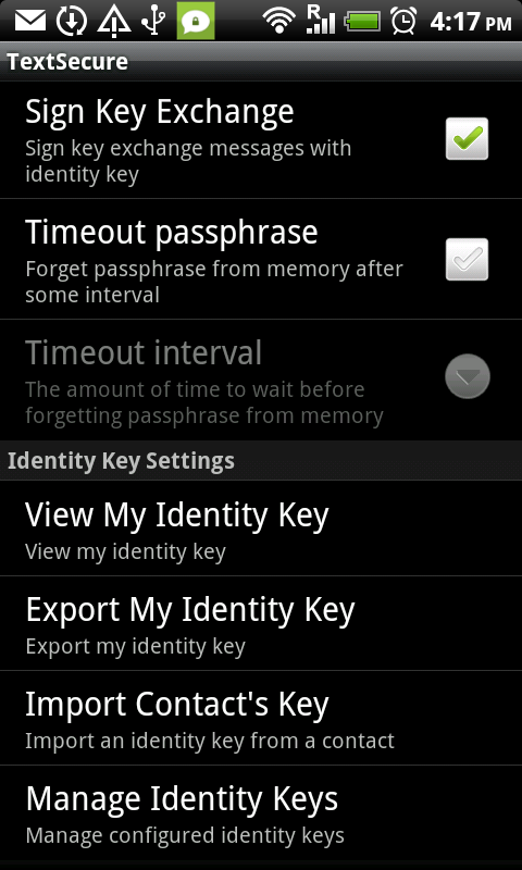This is the right moment to look at the various configuration options that TextSecure comes with. Most of them are self-explanatory. Securitywise it might be a good idea to look at the setting for the Passphrase timeout interval, and set it to a lower value according to your situation. If the timeout interval expires, and you want to few your messages again, TextSecure will ask for your password.