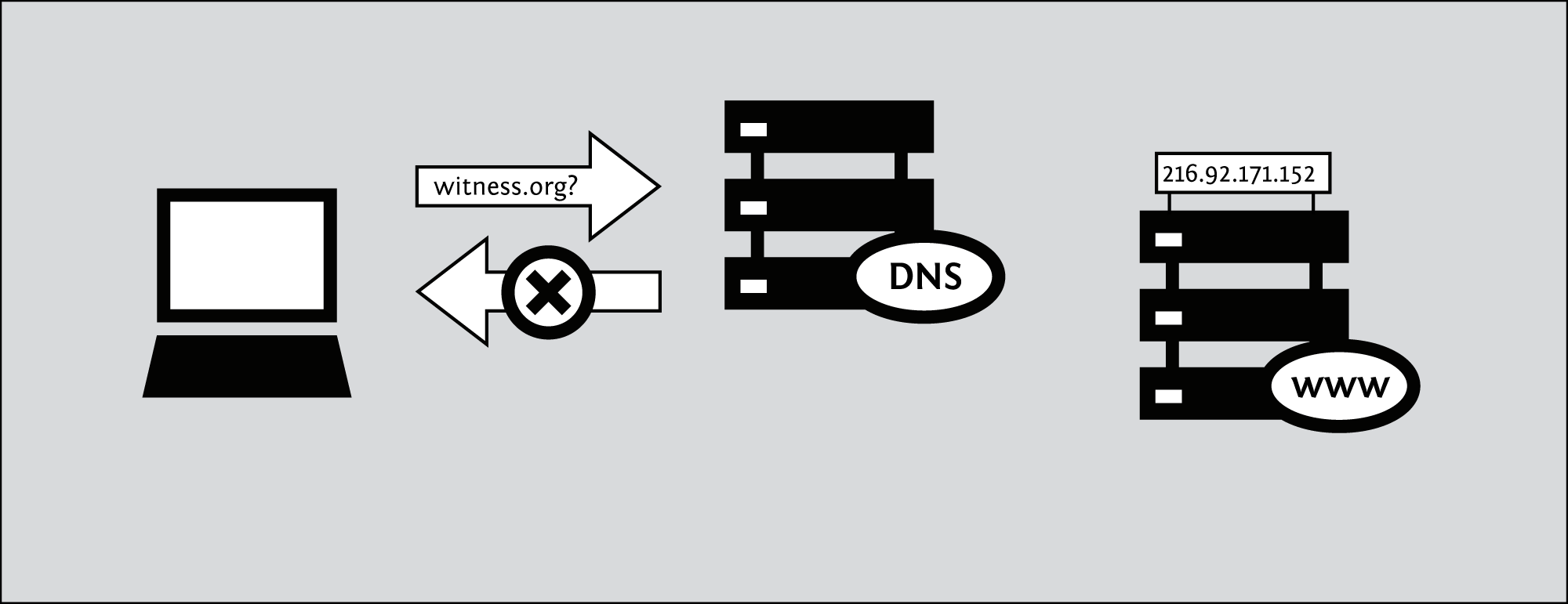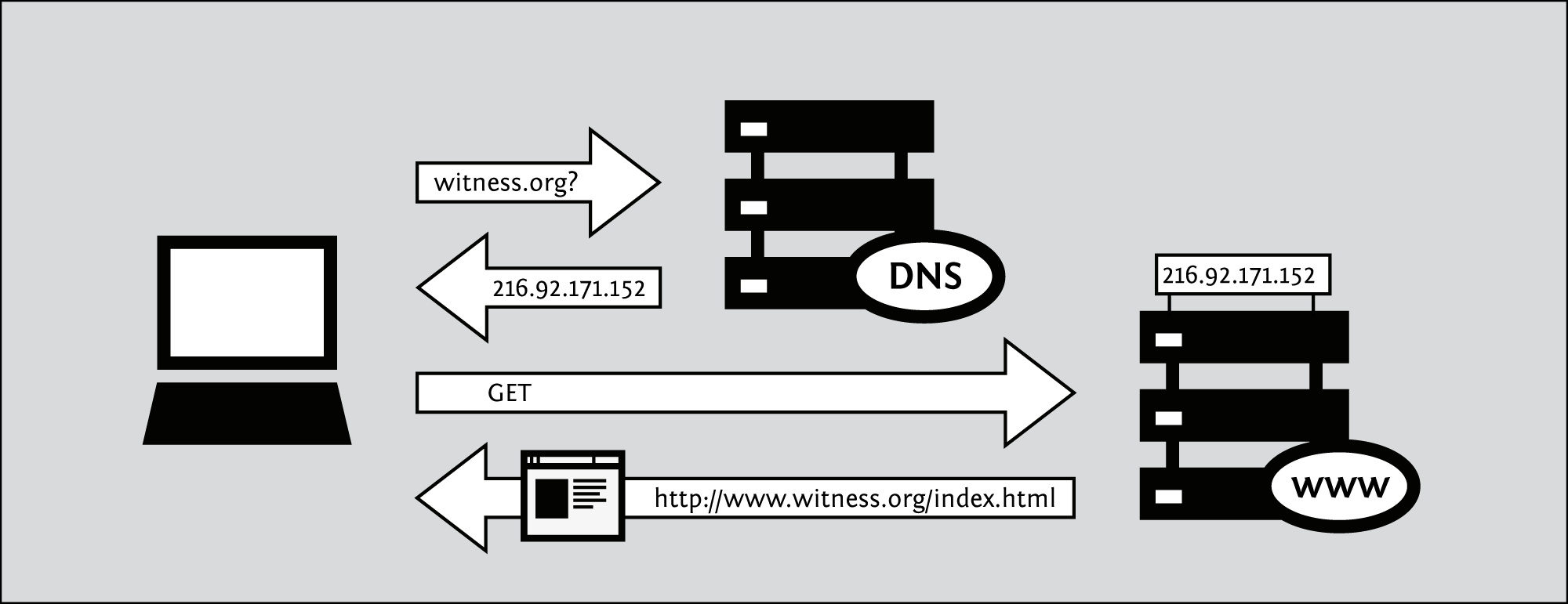 For example, to access the Witness Web site you would type in the www.witness.org address, also known as a domain name, instead of 216.92.171.152. Your computer then sends a message with this name to a DNS server. After the DNS server translates the domain name into an IP address, it shares that information with your computer. This system makes Web browsing and other Internet applications more human-friendly for humans, and computer-friendly for computers.