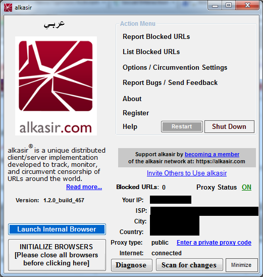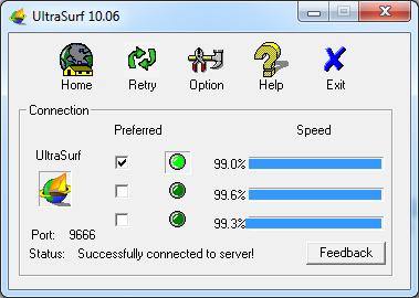 Ultrasurf is a free proxy tool for the Windows operating system which can be downloaded at http://www.ultrareach.com/, http://www.ultrareach.net/ or http://www.wujie.net/. The downloaded zip file has to be extracted with a right click and selecting "Extract All...". The resulting .exe file can be started directly (even from a USB flash drive in an Internet caf) without installation.