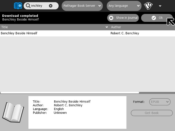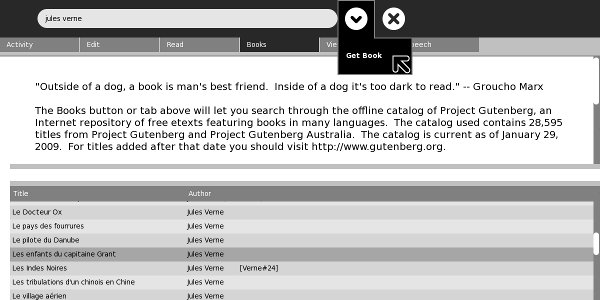 The Get Books Activity is the newest of the three. It lets users search for books from multiple online sources such as the Internet Archive and Feedbooks. It also provides support for removable devices ("Library on a Stick") which have OPDS catalogs in the root directory. OPDS (Open Publication Distribution System) is a kind of book catalog that anyone who publishes e-books can create. Currently the Internet Archive and Feedbooks have such catalogs, so Get Books can download titles from their catalogs. Feedbooks has titles from Project Gutenberg converted to PDFs. This means that you can find and download the majority of free e-books available to your Journal using this Activity.