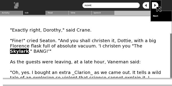 The Edit toolbar lets you search for text strings in your book, plus copy text selections to the clipboard. What may surprise you is that it can do this even for the books from the Internet Archive, which are made from scanned page images. This is because behind the page image is a text representation of the text on the page. In the screen shot above someone is searching for the word "Bingley" in Pride and Prejudice. Note that the search only works as well as the quality of the text representation allows it to. The text is created by OCR and is not proofread afterwards.