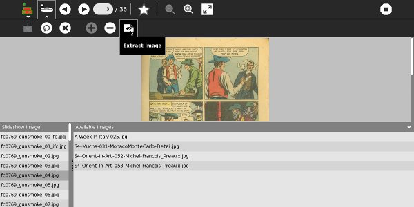 The Slides toolbar is used to organize the images in a .cbz file. You can add images, delete them, rename them, and extract images to create entries in the Journal. The Available Images column shows image files in the Journal as well as images on removable media like thumb drives and SD cards. The Slideshow Image column shows the images in your .cbz. When you select an entry in either column it will be previewed in the area above the image lists.