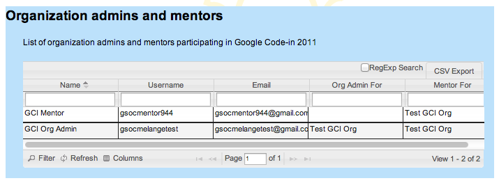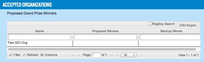 The Contest Administrator will send an email (outside of Melange) to all Google Code-in Organization Administrators explaining the steps involved in choosing their Grand Prize Winners. After the deadline for Organization Administrators to Submit their Grand Prize Winners and backup has passed, the Contest Administrator will review the results by going to Admin Dashboard -> Organizations -> Proposed Grand Prize Winners