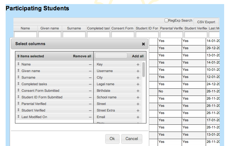At the bottom of the page, you'll see a Columns button that you can click to view all of the available columns of information for Students. To add that column to your view, click on the "+" button next to the field you'd like to move into your view. If you would like to hide a column click on the "-" next to the field. To move the order of the viewable columns click on the name of the column you'd like to reorder and drag it to the top or your desired location. Click Ok.