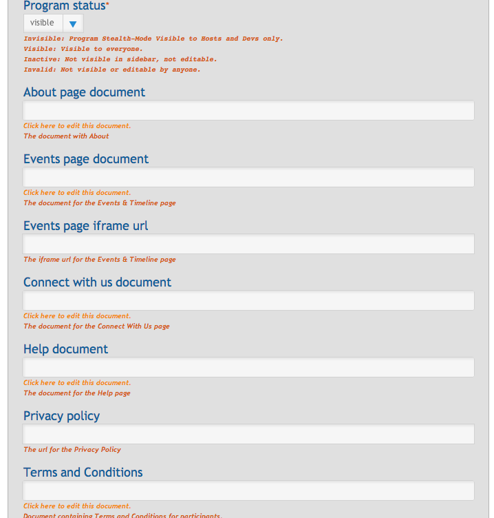 There are two types of data on the Edit program settings page, documents and non-document data. Documents, as explained in this section, is a list of webpages that exist on Melange for a specific contest and are created before the contest begins outside of Melange in a text editor. A contest’s non-text data (for instance, minimum age of Students, number of accepted Organizations, etc.) can be updated directly on the Edit program settings page.