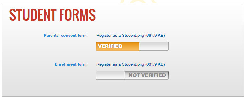 Hold down the "Command" key and click anywhere on the line of the Student forms you'd like to download from the list of student. A new tab is opened with the Student's profile. From there you can see the Student's entire profile with the Student forms at the top. Download each form to your desktop and view them. If they are correct, go back to the Student's profile page and drag the slider bar for the appropriate form to "verified."