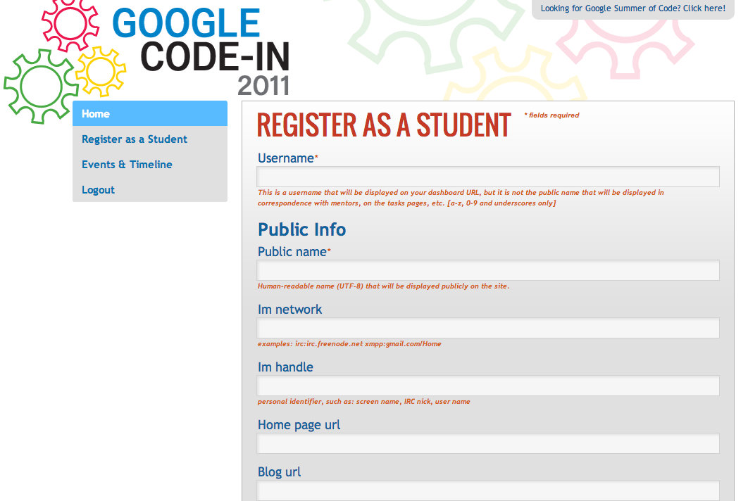 Profiles are created on the Register as a Student, Register as a Mentor, Register as an Organization Admin page. If you have not registered on the website for any previous contests, you also have to create a username (in addition to all the other profile information you are asked as described below) which will be a part of various URLs throughout the website. This username will be publicly exposed to other users, so it should not contain any sensitive personal information.