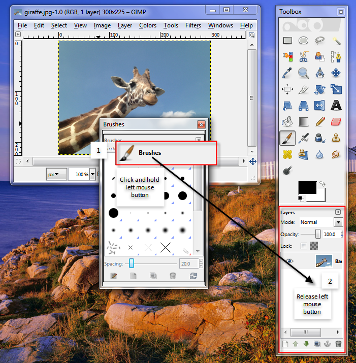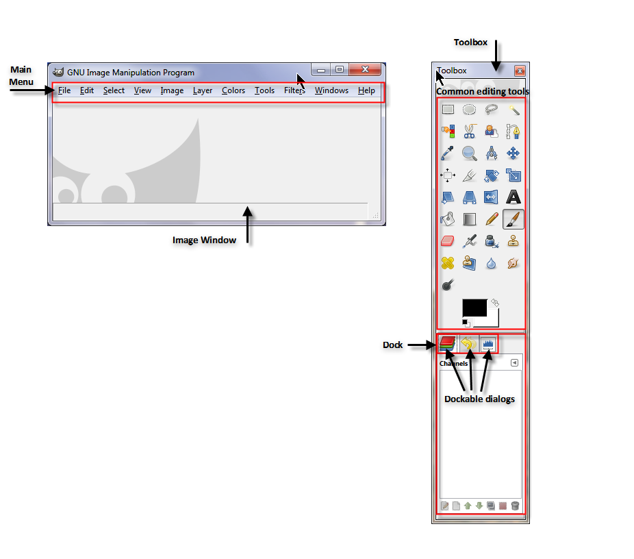 The GIMP interface consists of two main elements: the Image window and the Toolbox.