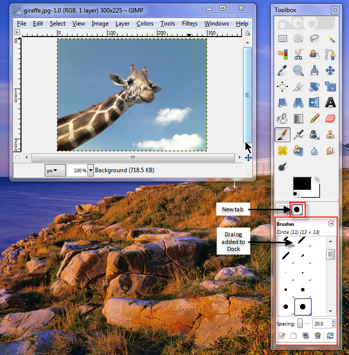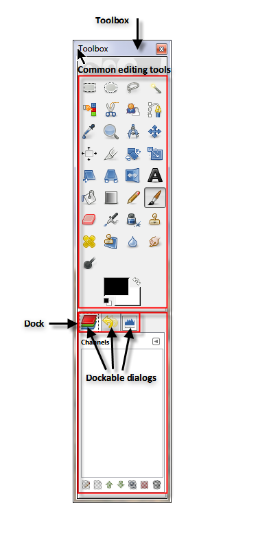 The Toolbox is a sidebar that contains both image editing tools and the Dock. The Dock is a container window where Dockable Dialogs can be stored for easy access. Dockable Dialogs are additional features not included by default on the Toolbox. Think of the Dock as your own customizable Toolbox.
