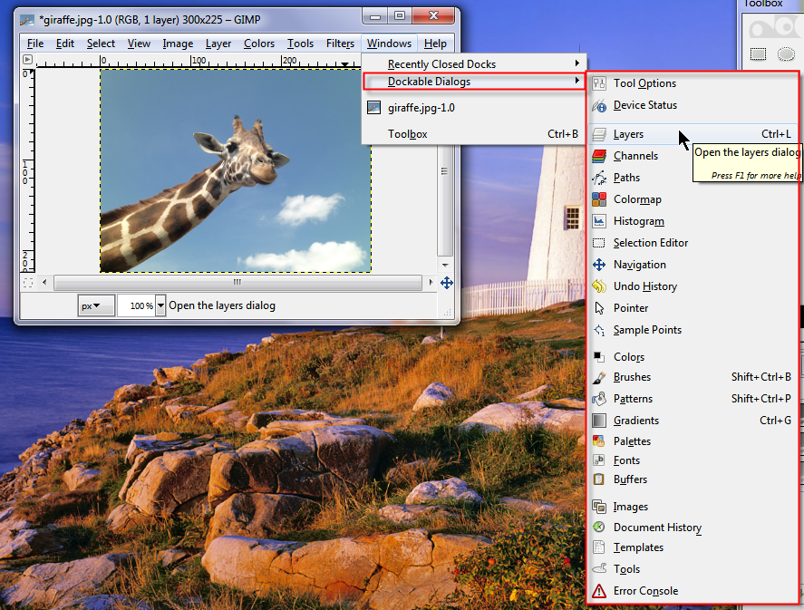 The Image window is similar to a painter's canvas. This is where images are opened up and contained during the editing process. At top of the Image window is the Main menu, which includes a row of sub-menus. These sub-menus access nearly all functionality of GIMP. Options from saving a file, to selecting specific tools and filters, to working with layers are controlled here. The nice thing about GIMP is that it allows the use of multiple Image windows within the same session. This is especially helpful when working with layered images or creating animated GIFs.