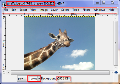 Aside from displaying the image you're editing, the Image window also provides basic file information including: file name, file size, dimensions, and number of layers. There's also an option to adjust the zoom level, which refers to the view an image is scaled to. When images are first opened, GIMP automatically adjusts this view so the entire image is visible.