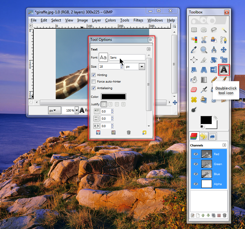 Each tool on the Toolbox also has its own Tool Options. For instance, the Text Tool contains options such as Font, Size, Color, and paragraph alignment.
