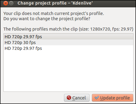 إذا كنت تعمل مع مادة فيلمية من أكثر من مصدر واحد وكانت في صيغ مختلفة، يجب أن تختار الإعدادات ذات أعلى جودة لفيديوهاتك المختلفة، ويجب أن يقوم برنامج Kdenlive بتحويلها لتعمل داخل المشروع.