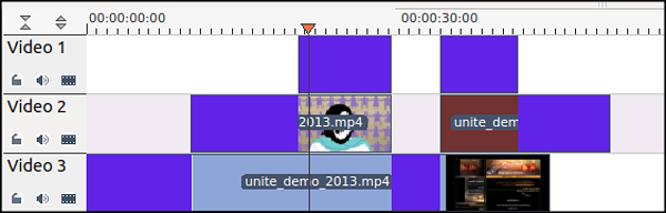 بصورة طبيعية، سترى فقط المحتويات من المسار الموجود في الجزء الأعلى. لذلك، إذا كانت لديك لقطات في المسار 1 و2، سترى فقط محتوى المسار الأول. ومع ذلك، إذا كان المسار 1 فارغاً، يحظى محتوى المسار 2 حينئذ بالأولوية وسيكون مرئياً بدلاً من محتوى المسار 1. في الشكل أدناه، تشير المناطق باللون البنفسجي إلى لقطة الفيديو التي ستكون مرئية خلال إعادة التشغيل..