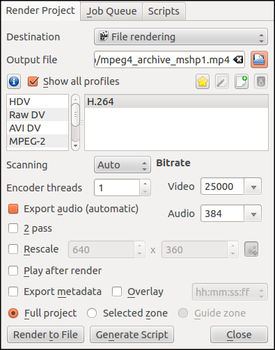 هناك العديد من الخيارات لأرشفة ملفات المشروع الخاص بك. في أجزاء أخرى من الدليل ناقشنا استخدام ملفات mp4 بتشكيل جانبي H.264. لأرشفة مشروعنا في صورة ملف يمكننا تكرار العملية لكن استخدم بترات Bitrate فيديو وصوت أعلى للتأكد من قلة فقدان الجودة..