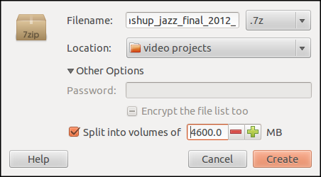 إذا كان حجم الملف المضغوط أكبر من حجم القرص الواحد يتعين علينا تقسيم الملف المضغوط. في هذا المثال في نظام أوبنتو اتبع الخطوات التالية.
