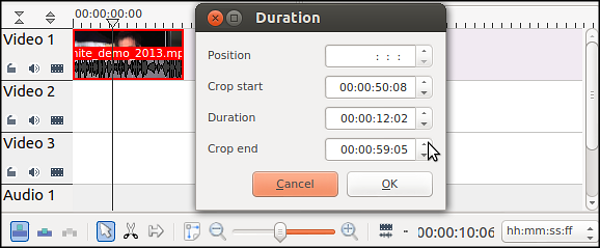 لإضافة هذا الاختيار إلى التسلسل الزمني (الذي يقوم بعمل لقطة جديدة) انقر الفيديو في شاشة اللقطات Clip Monitorالخاصة بك واسحبه في التسلسل الزمني الخاص بك. كما يمكنك استخدام اختصار لوحة المفاتيح v