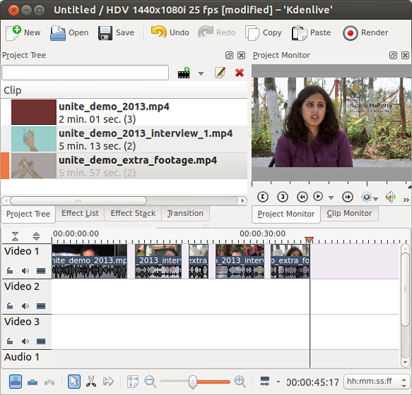 في هذه المهمة ستقوم بإنشاء فيديو بمسار واحد من ثلاثة مقابلات فيديو. سيتعين عليك استخدام على الأقل مقطعين صوتيين من كل مقابلة. كما يتعين عليك متابعة طريقة انسياب الفيديو من أحد أجزاء المحرر الخاص بك إلى الجزء التالي خلال عملية التحرير: من شجرة المشروعProject Tree إلى شاشة اللقطات Clip Monitor، ثم إلى التسلسل الزمني Timelineوشاشة المشروع Project Monitor.