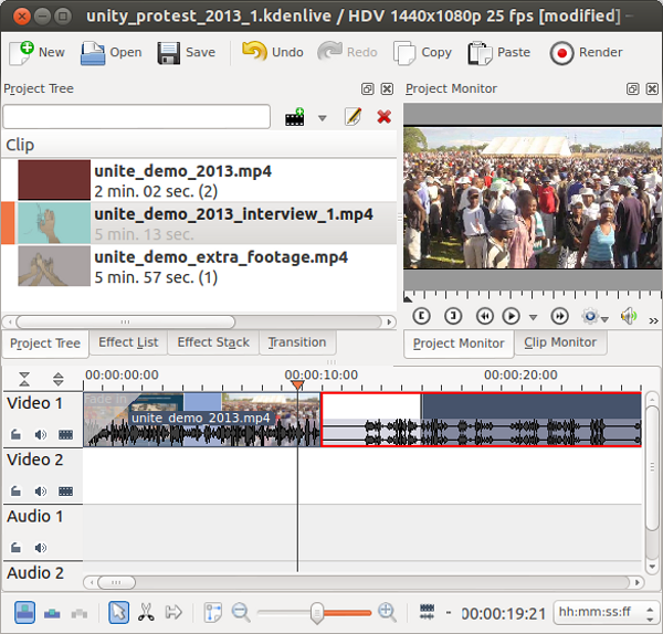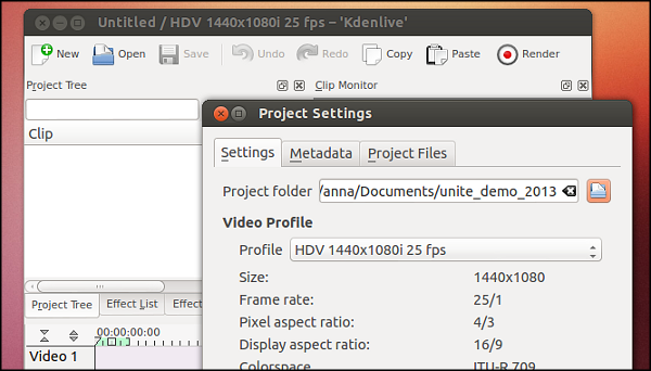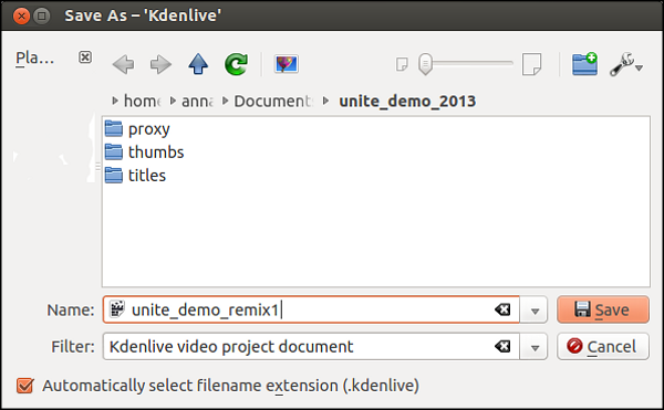 بعد ذلك، احفظ ملف المشروع: انقر File > Save Asواختر اسماً مناسباً. يختلف ذلك عن إعداد مجلد المشروع Project Folder: يمكن أن يكون لديك العديد من ملفات المشروع Project files، العديد من عمليات التحرير المختلفة، في نفس مجلد المشروع Project folder.