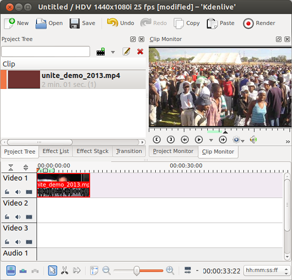 أنت الآن جاهز لإجراء عملية التحرير. أولاً – يتعين عليك عمل لقطة جديدة من المادة المصدر الخاصة بك. انقر اللقطة الأولى في شجرة المشروع Project Tree الخاصة بك وستظهر في شاشة اللقطاتClip Monitor.