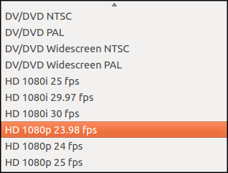 إذا لم تكن متأكداً حينئذ اقرأ الجزء الخاص بأنواع الفيديو لاحقاً في هذا الفصل أو قم باختيار أي جانب تشكيلي. ويمكن أن يقوم برنامج Kdenlive بتحديث الجانب التشكيلي إلى النوع الصحيح عندما تقوم بإضافة ملفات الفيديو إلى المشروع.