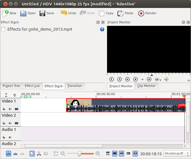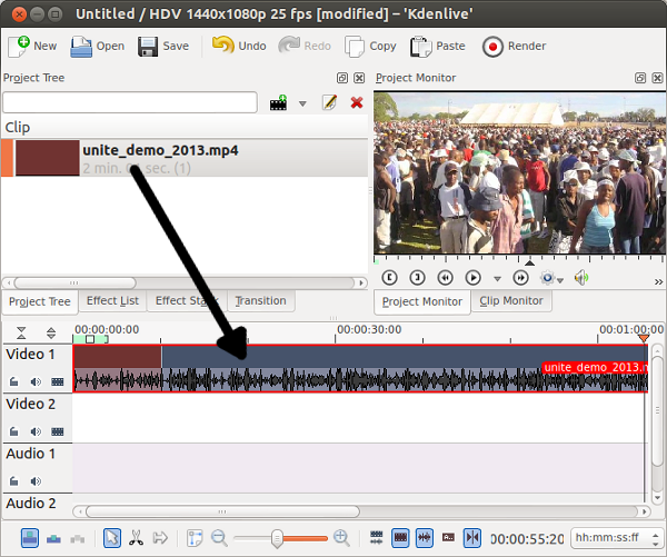 ابدأ برنامج Kdenlive بالطريقة العادية. قم بجلب ملف الفيديو الخاص بك عن طريق النقر على Project > Add Clipفي القائمة العليا.