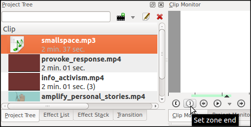If you only want to use a small part of the music track, then firstly click on the song you want to use and the preview it in the Clip Monitor. When you have found the part to want to use, select an in-point and out-point using the square-bracket buttons Set Zone start and Set Zone end.