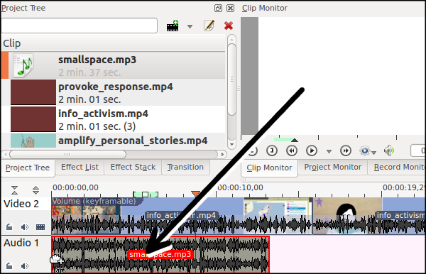 You will see the region you have selected is now highlighted in green. Click on the clip monitor screen in the white area and drag your new audio clip into your audio track.
