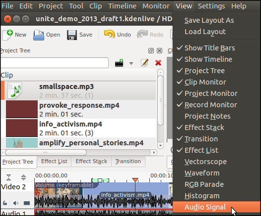 As you play your Timeline in the Project Monitor, you will notice that the audio signal goes up and down.