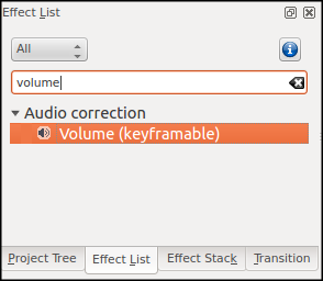 Click on the Effects List tab in the project area. Type in 'Volume' in the box at the top to search for the Volume (keyframeable) effect.