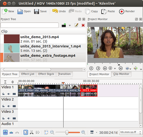 In this task you will create a single track video from three video interviews. You need to use at least two sound bites from each interview. You will also see how the video flows from one part of your editor to the next during an edit. Clips move from the Project Tree to the Clip Monitor, then to the Timeline and the Project Monitor.