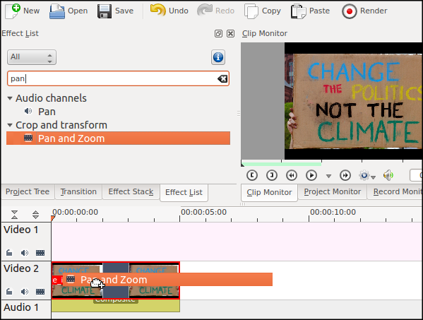 Add the picture to your project, and then to the timeline. Search for the Pan and Zoom effect in your Effects List. Drag the effect onto the image clip in the timeline.