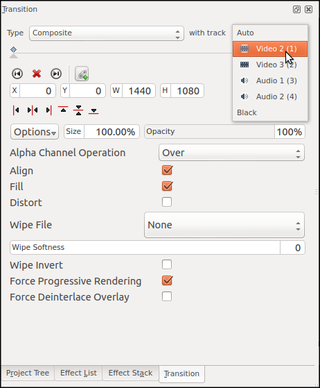 A Composite transition should appear automatically. The composite transition means that all transparent areas (for example, your title clip background) will allow footage from the adjoining/specified level to show through. In the diagram below, all the purple areas are visible. The composite transition is tied to track two, so both track one and two are visible.