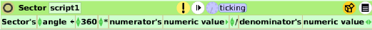 The numerator and denominator are text objects. They can have variables of type numeric. The script gets the numerator and denominator needed to create a fraction. The fraction of 360 degrees (value 1 for the whole of the pie) is visualized by the sector object. The sector is a visualization of the fraction.