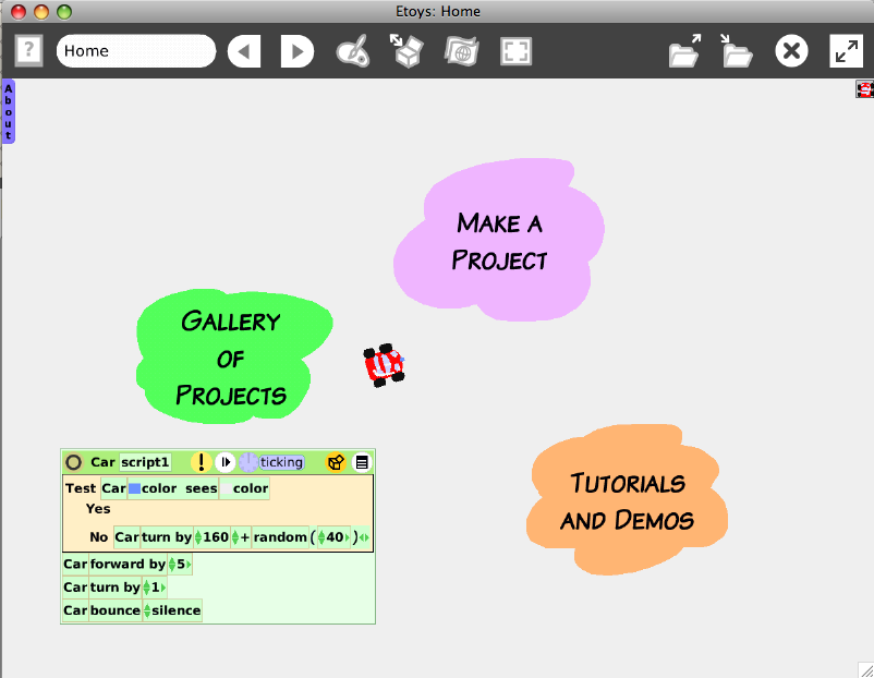 Etoys is a tile based programming environment for children that was built on Squeak by a team headed by Alan Kay. The child friendly design of the interface was influenced by the education theorist Seymour Papert, who many consider the driving force behind the use of computers in education. If you can use a mouse you can use Etoys.