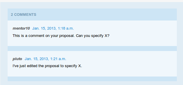 From the same interface you can answer the comment and edit your proposal if necessary. You cannot edit or delete submitted comments. Please note that the comments you make are visible to all Mentors and Organization Administrators from that organization, but are not visible to others.