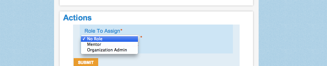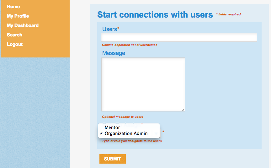 You will then be taken to the list of organizations available to mentor for. Choose the organization you wish and you will be taken to a form in which you can include a message to your Organization Administrator about why you would like to participate in the program. Then press the Submit button.