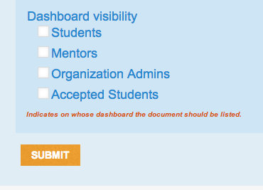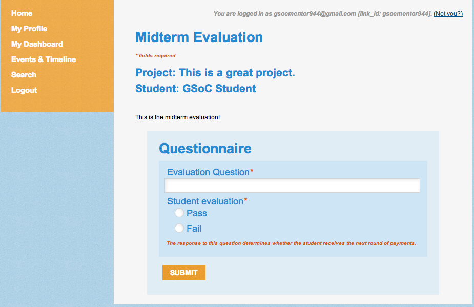 Students will be asked to upload a code sample to Melange after the final evaluation. As an Organization Administrator, you may be how to do this, or what code to submit. Please refer them to the Student section of this manual for more information.