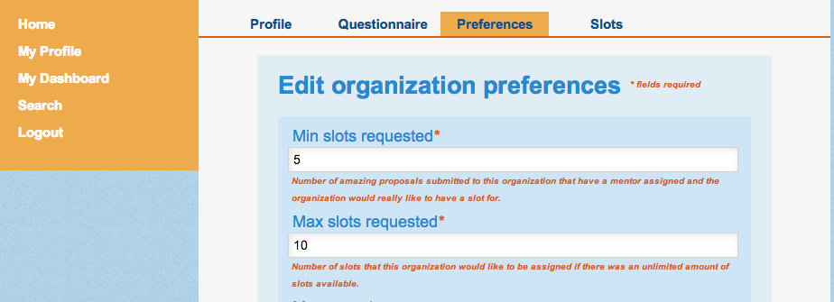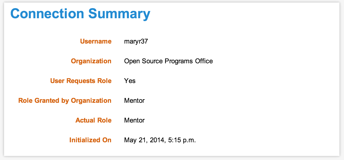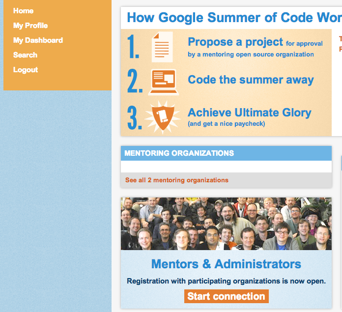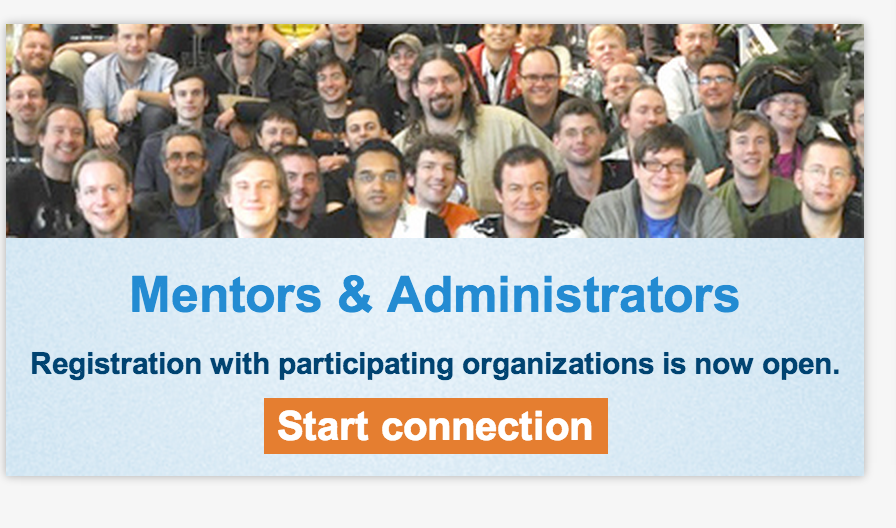 Once you have created a profile in Melange you can apply to be a Mentor for the particular organization (or organizations) with which you would like to work. To apply to be a Mentor for each organization, click on the orange "Start connection" button on the homepage.