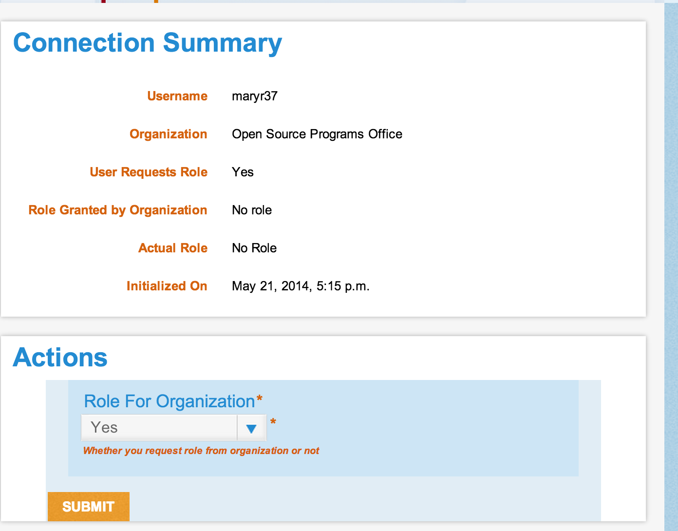 You will then see a Connections Summary page. This page lists all of the connection history between you and the organization. Under the "Action" box, click on the Yes button and hit Submit.