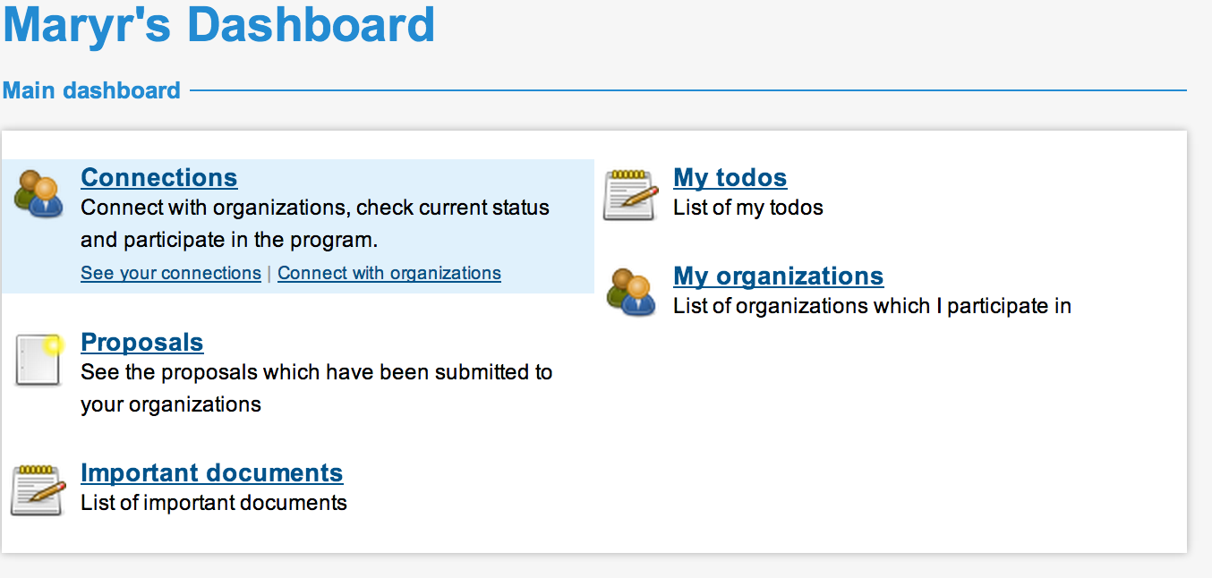 You may also notice that more options show up in your dashboard including "Proposals", "Important Documents", "My ToDo's" and "My Organizations".