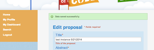 - After you click on Submit, you'll be taken to a read-only view of your proposal. To edit you must click on Edit Proposal under the title. If your submission is accepted into the system, you will see a green bar across the top of the form which says, "Data saved successfully". If you do NOT see this green bar, your proposal has not been saved and you MUST click Submit again.