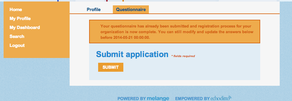 Once you have logged in and created a profile, click on your Home tab in the dashboard and Melange shows you a new section of the homepage (see bottom middle of the page) under "organizations apply" and click on Begin registration.
