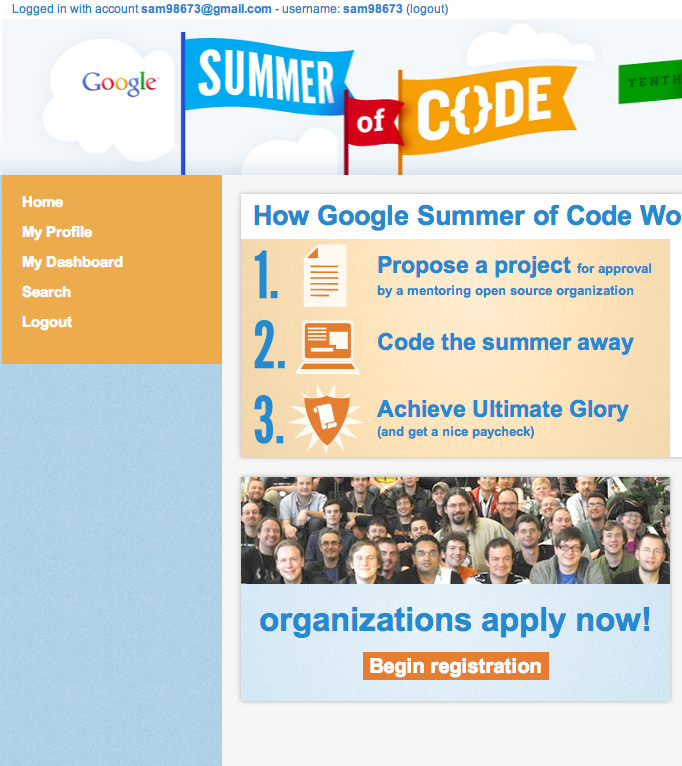 You have one last important step to complete before you can submit a proposal to Google Summer of Code - submitting your proof of enrollment in an accredited institution of higher learning. Begin by returning to the homepage.