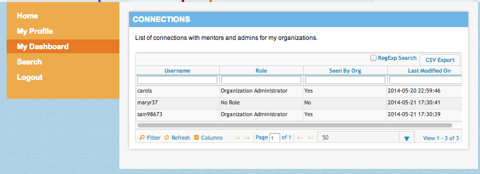 Click on My Dashboard --> Connections --> See your connections. Your "Connections Summary" page will change to reflect your status as a mentor (see "Role Granted by Organization").